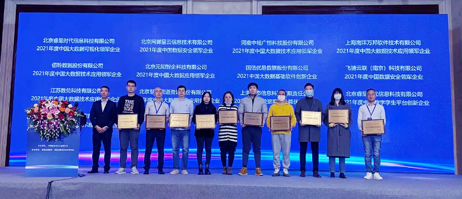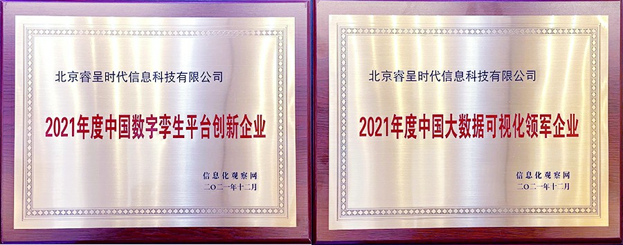 会议期间举办了大数据年度颁奖典礼,睿呈时代荣获“2021年度中国大数据可视化领军企业”、“2021年度中国数字孪生平台创新企业”两大奖项。